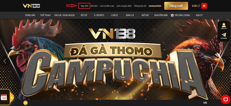 Bước 1: Đầu tiên người chơi cũng cần truy cập vào trang chủ của VN138 => thực hiện đăng nhập tài khoản với tên đăng nhập và mật khẩu đã đăng ký tài khoản trước đó. Sau đó chọn mục “Nạp tiền” tại vị trí trên cùng của màn hình.