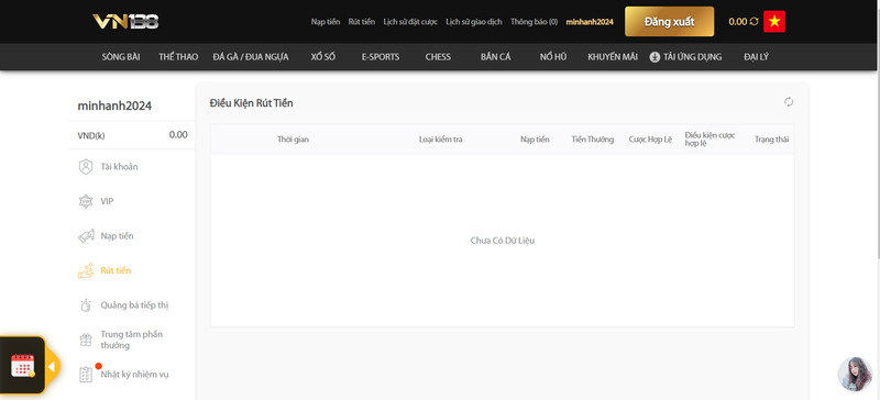 Người chơi khi muốn rút tiền VN138 phải đảm bảo rằng số tiền thắng cược quy về tài khoản chính phải lớn hơn hạn mức giao dịch tối thiểu theo quy định. Điều này để đảm bảo rằng bạn có thể dễ dàng thực hiện thao tác đổi thưởng thành công.