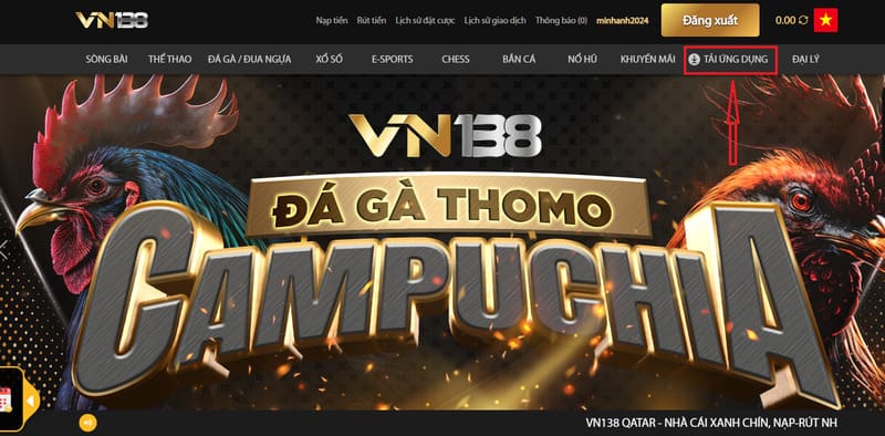 Chọn mục “Tải app” trên giao diện chính của VN138